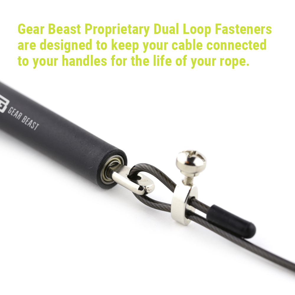 | Traditional screw fasteners can loosen over time and the jump rope can fly apart during your toughest workouts. Gear Beast Proprietary Dual Loop Fasteners are designed to keep your cable connected to your handles for the life of your rope. No longer will you have to go searching for the tiny screw that flew off or try to keep track of extra fasteners. |